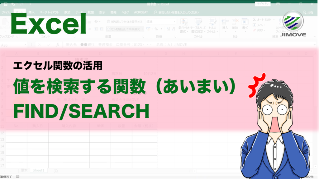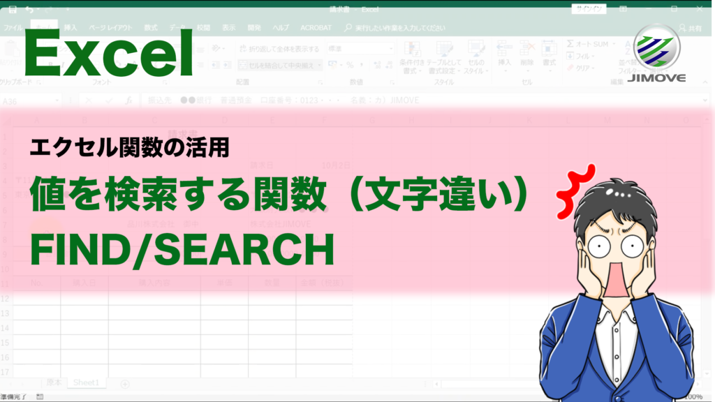 Youtubeで公開している内容をまとめたものです。 FINDとSEARCH関数の違い こんにちは、JIMOVEの山口です。 今回はExcelで文字列の中から特定の文字列が何文字目に存在するかを検索するFIND関数とSE