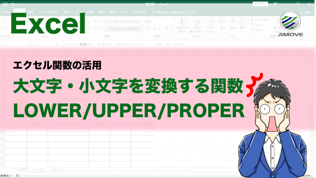 Youtubeで公開している内容をまとめたものです。 大文字・小文字変換関数の活用 こんにちは、JIMOVEの山口です。 Excelでの大文字・小文字変換方法について、ご紹介します。 商品コードや人名など、入力の統一が必