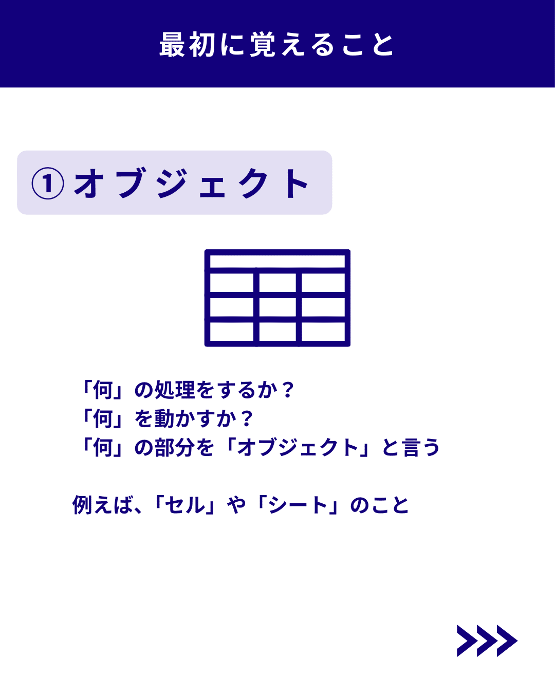 主に「何」の処理をするか、「何」を動かすかの「何」にあたる部分で、例えば「セル」の背景色を赤にする、など「何」を対象にするか、がオブジェクトです。