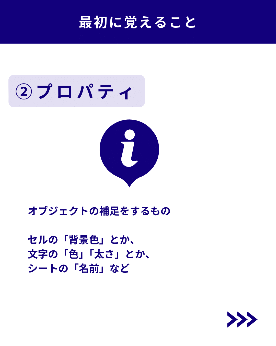 プロパティについては、オブジェクトの補足をするもので、セルの「背景色」や文字の「色」「太さ」や、シートの「名前」などの部分を言います。