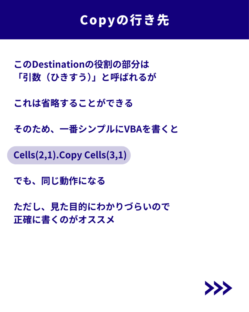 VBAのコードを知っている方であれば、これがDestination(行き先)を省略していると分かりますが、他の方が見たときに何を表しているかわからない可能性があります。