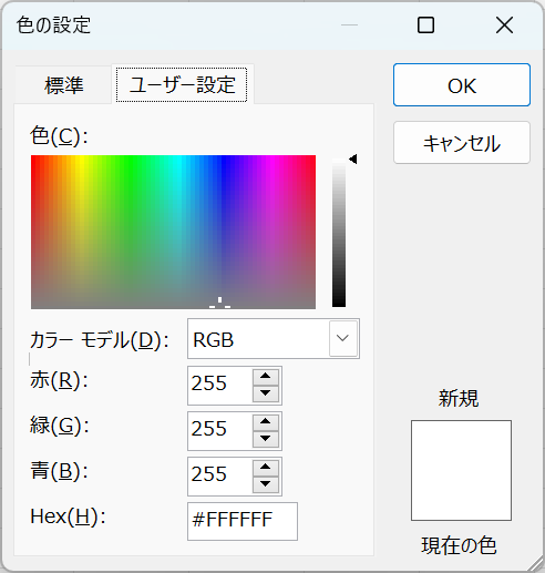 上記の「色の設定」では「白」はRGB(255,255,255)」であること、Hexは「#FFFFFF」であることになっています。